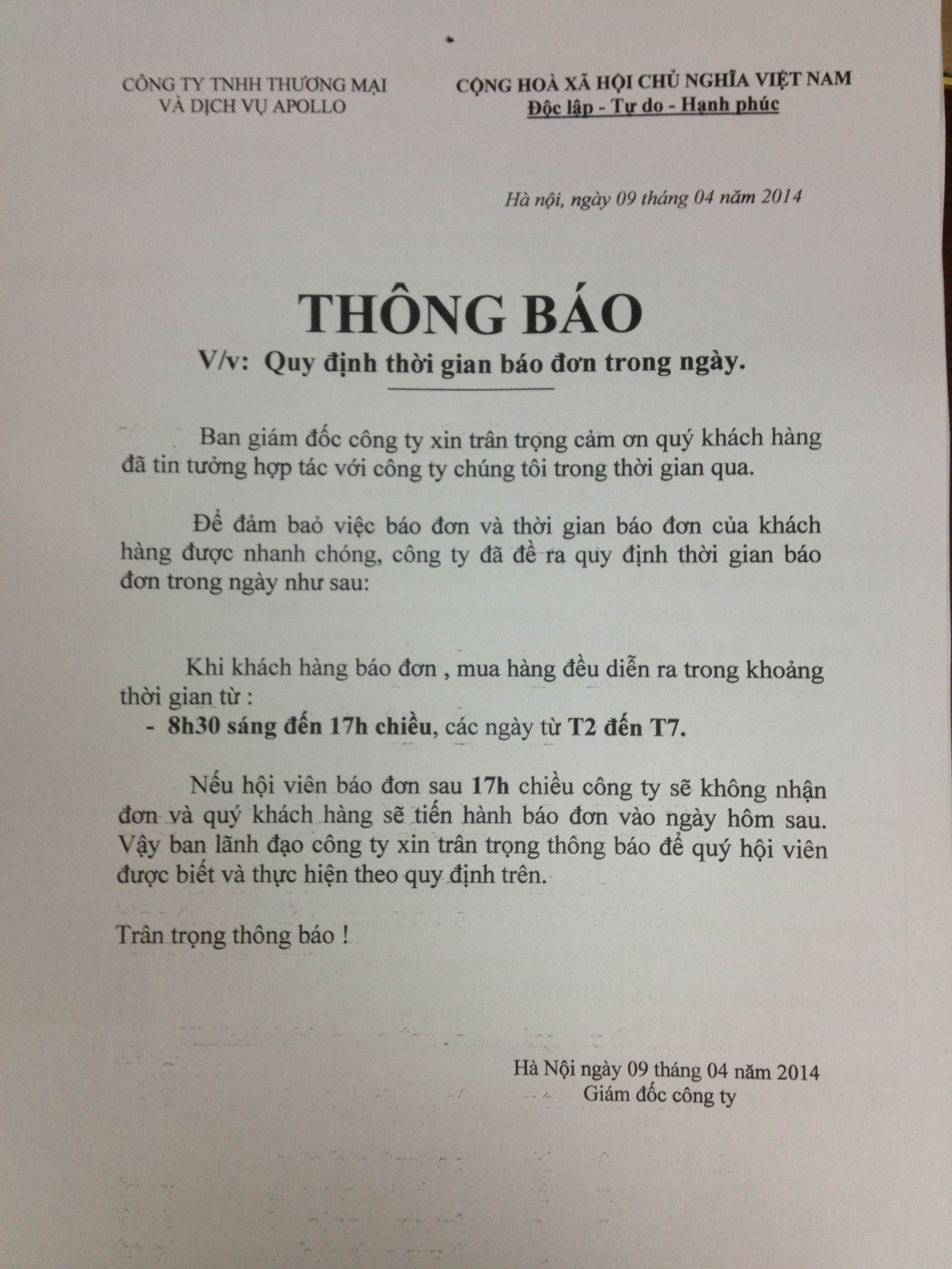 (Apollo Việt Nam) – Công ty TNHH thương mại dịch vụ Apollo xin trân trọng thông báo tới quí hội viên về thời gian báo đơn trong ngày như sau: